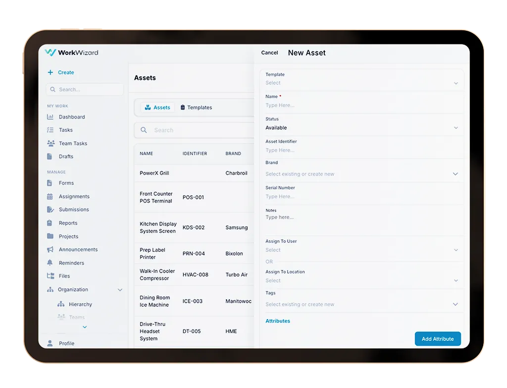 Every business tracks different information for its assets. WorkWizard allows you to create custom attributes so you can store the exact information that matters to your team.