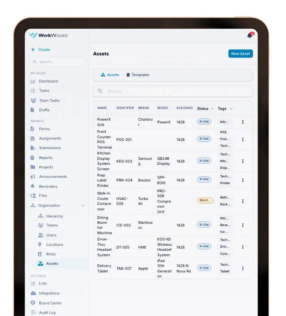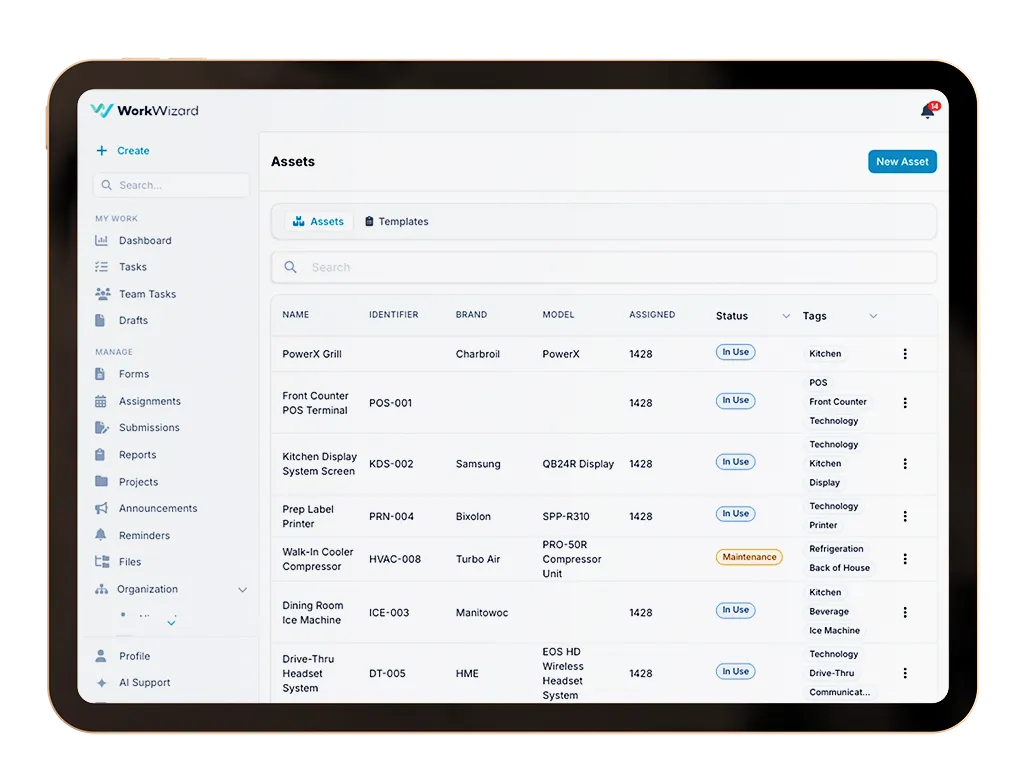 WorkWizard helps your team stay organized by giving you visibility into asset status, maintenance history, ownership, assignments, and replacement needs across every location.