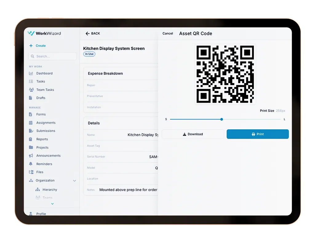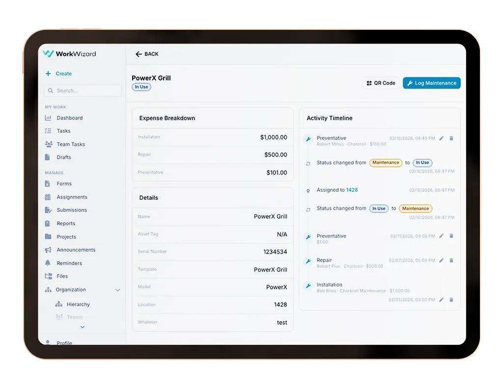 From equipment assignments to maintenance history, WorkWizard’s Asset Management feature helps you keep every important asset detail organized and easy to access. By centralizing asset information, statuses, QR codes, maintenance logs, and location assignments, WorkWizard helps reduce downtime, improve visibility, and keep your team aligned across every location.