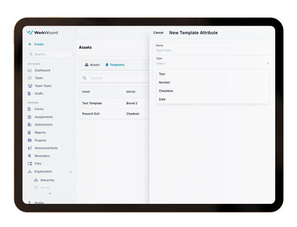 For businesses managing multiple assets of the same type, WorkWizard makes data entry faster and more consistent with reusable templates.